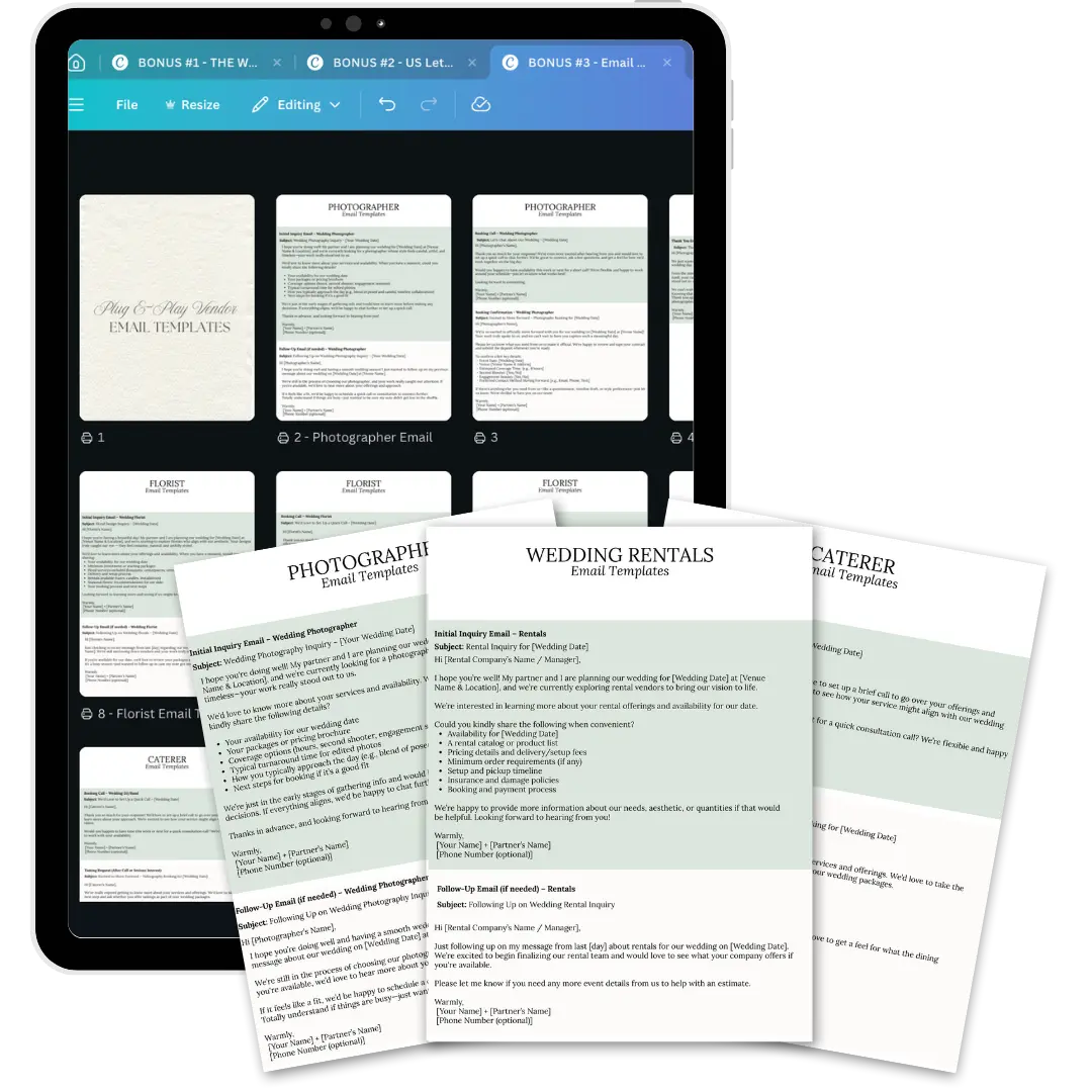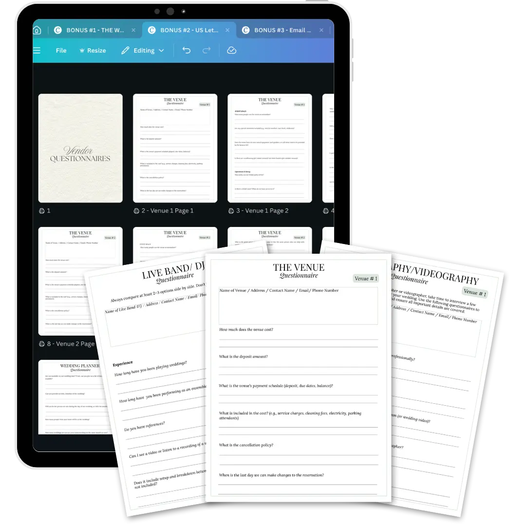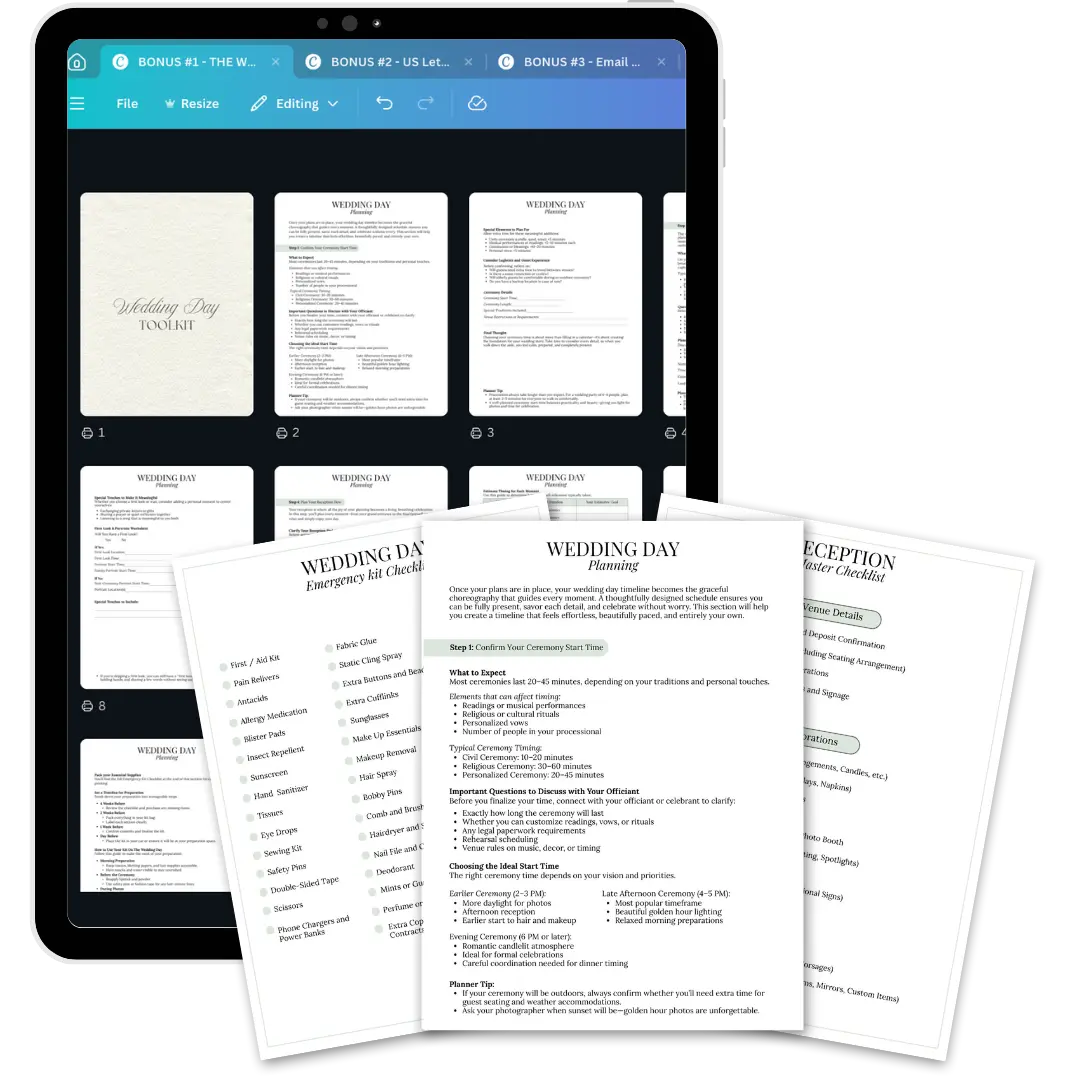 The Wedding Planning System™ includes 300+ beautifully designed, step-by-step Canva templates that walk you through every phase of the wedding journey from “yes” to “I do.” Whether you're budgeting, choosing vendors, designing your reception, or creating a timeline, you’ll have expert guidance at every turn.