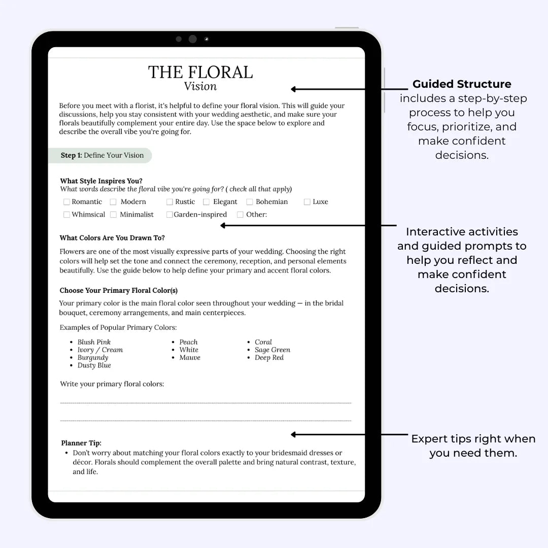 • Fill In & Customize: Complete prompts, checklists, tables, and questionnaires right in the planner.